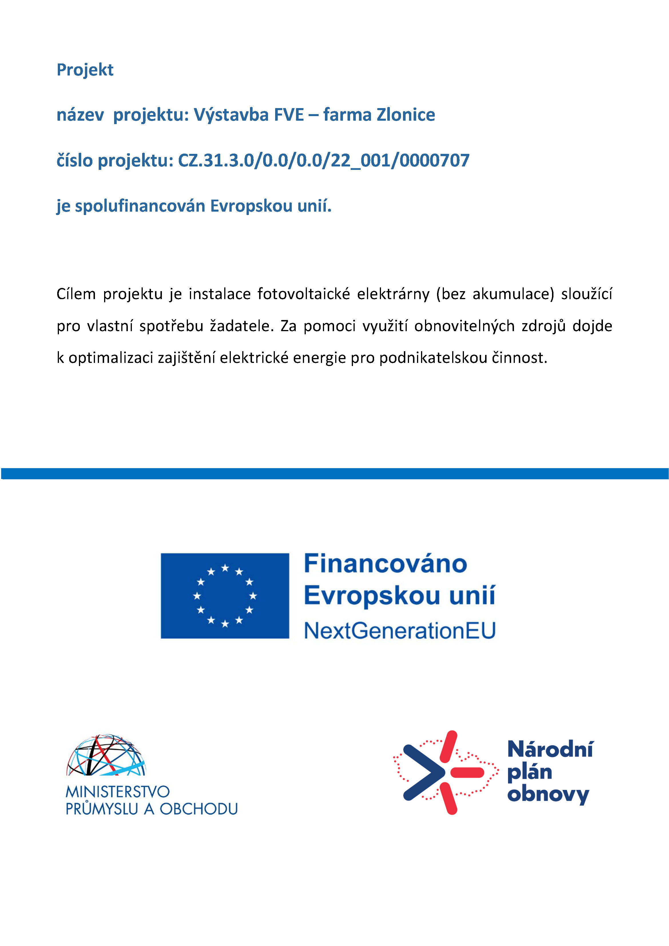 je spolufinancován Evropskou unií. Fotovoltaická elektrárna (FVE) je o  instalovaném výkonu 502,775  kW (bez akumulace).   Adresa místa realizace: k. ú. Zlonice, obec Zlonice, okres Kladno. Parcelní čísla budov na kterých je FVE umístněna je  p.č. st. 617, 618, 613, 625, 624, 623, 622, 621, 620. Cílem výstavby FVE je zajištění částečné energetické soběstačnosti podniku a snížení nákladů na elektrickou energii.